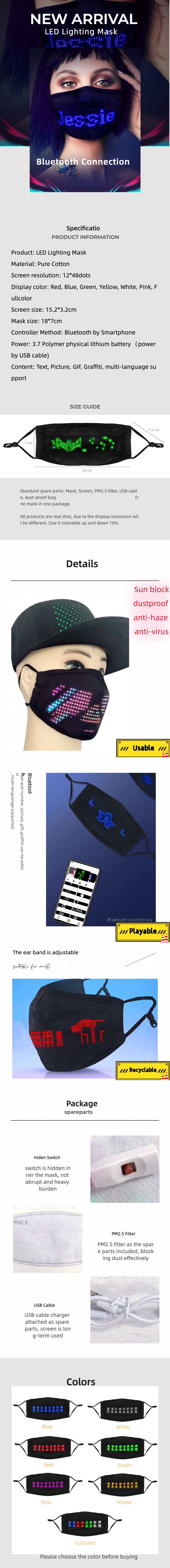 LED light masks can work by a 3.7 battery and we’ve prepared USB cable as power charger. Screen is long-term used. Meanwhile, we’ve attached the PM2.5 filter as the spare parts. The dust-proof bag is useful to protect the mask into a second used.